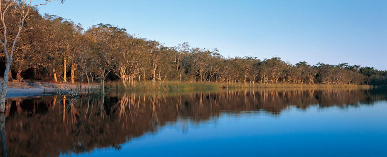 - Swim at Bummiera (Brown Lake), coloured by therapeutic tannins from native ti-trees framing the lake. Bummiera is significant to the Quandamooka people and said to be home to the mythical Bunyip.